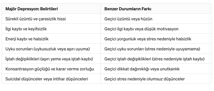 Her semptomun önemi tanısı üzerindeki etkisi, bu tabloda açıkça vurgulanmıştır. Ayrıca, geçici üzüntü veya stresle karşılaştırılan belirtiler, genellikle kısa süreli ve spesifik bir olayla ilişkilidir ve zamanla kendiliğinden düzelir.